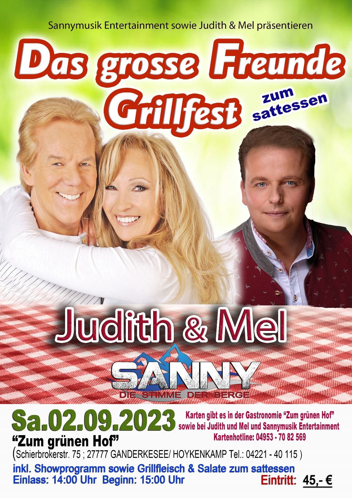 Der Ablauf ist wie folgt: 15:00 Uhr Beginn mit einem Auftritt ( ca. 20 Min. ) unseres Freundes und Kollegen SANNY und danach um 15:20 – 15:45: Auftritt von JUDITH & MEL (ca. 20 Min. )
